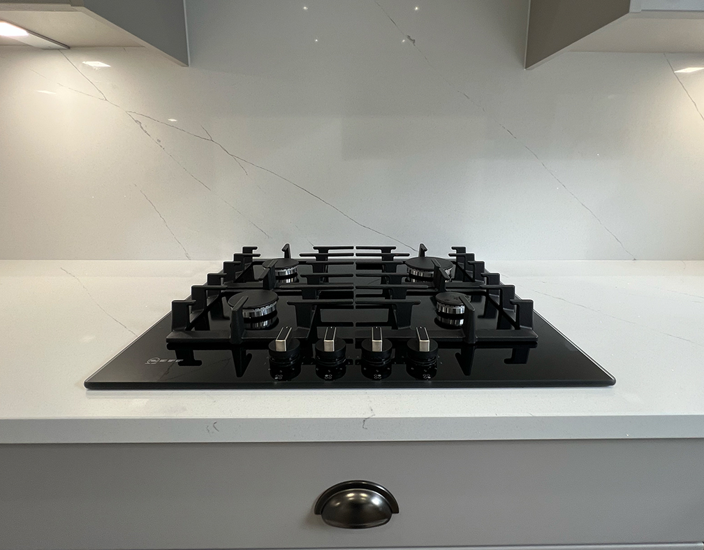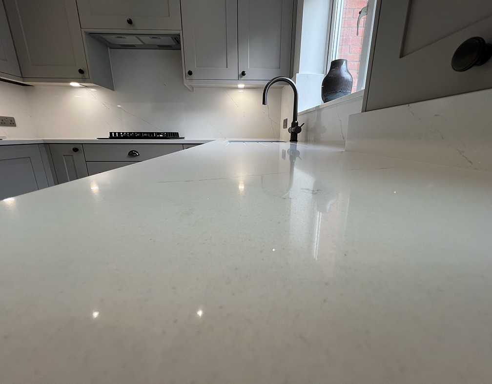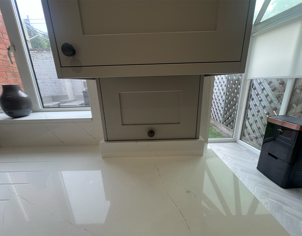 Statuario Ice Quartz including window sills and full height splash backs
