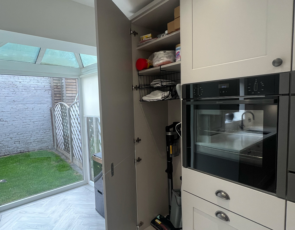Le Mans pull out corner unit. Tall larder units, one for the fridge freezer and the other as a utility unit for storing, mops, brushes, hoover and cleaning products