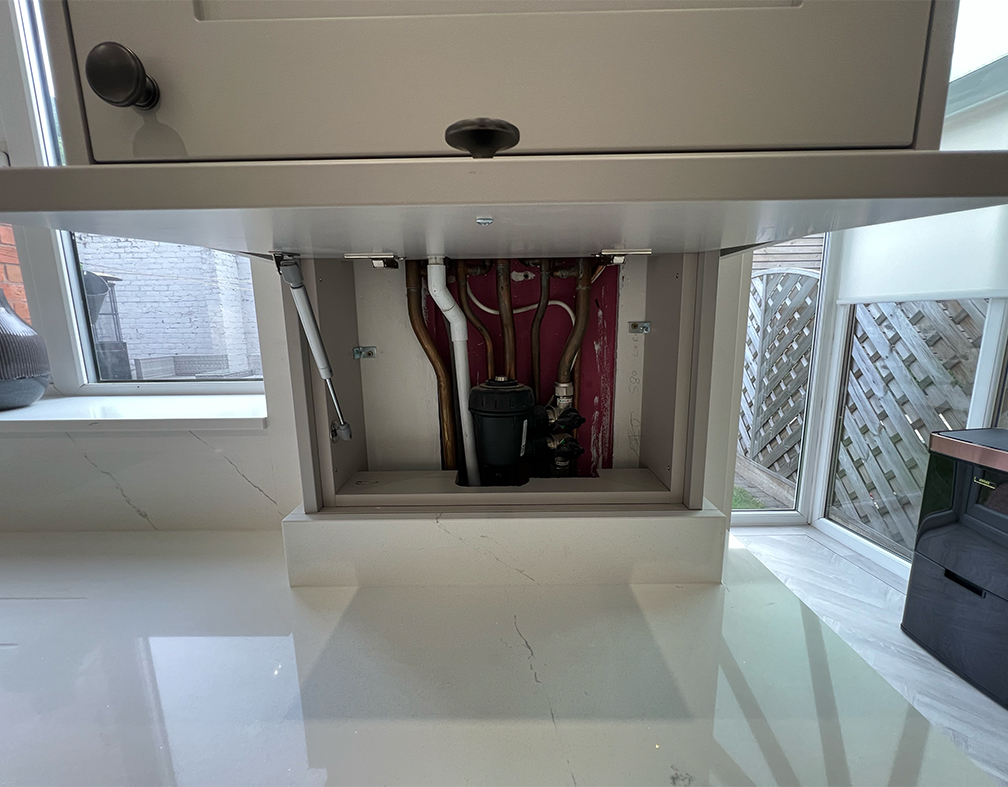 As the boiler was staying in the kitchen space we disguised it with this wall cupboard and box to conceal the controls and wiring.
