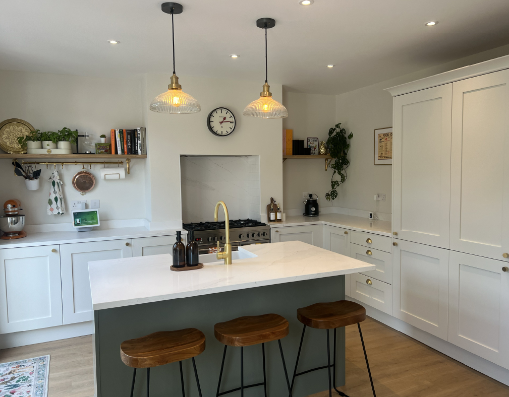 Laura and Sharan chose Mornington Shaker for their doors and tall larder units in a combination of Porcelain and Regiment Green for the island, complimented with Gold Mist Quartz from the Ita Stone Range. A clean, fresh and timeless choice matching perfectly with the rest of their tastefully decorated 1920s property.